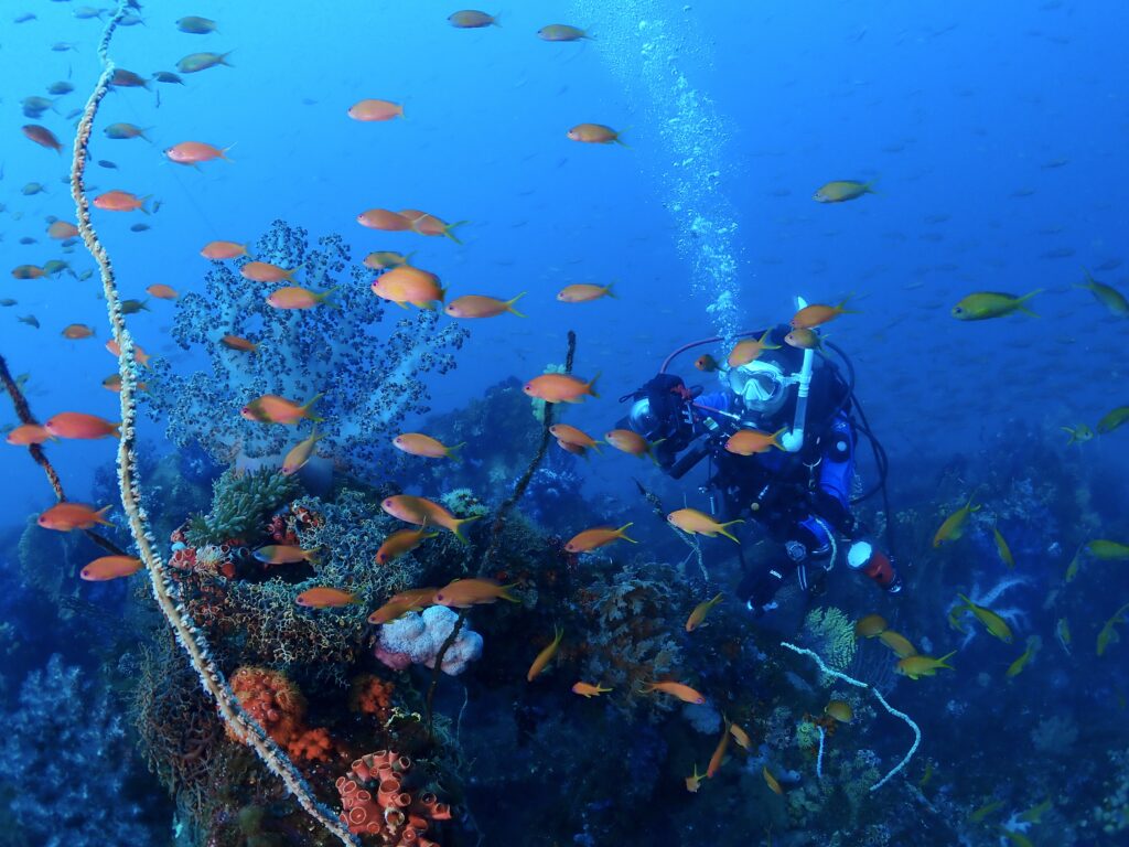 この時期は透明度が良いので水中スクーターで水中遠征ダイブ!